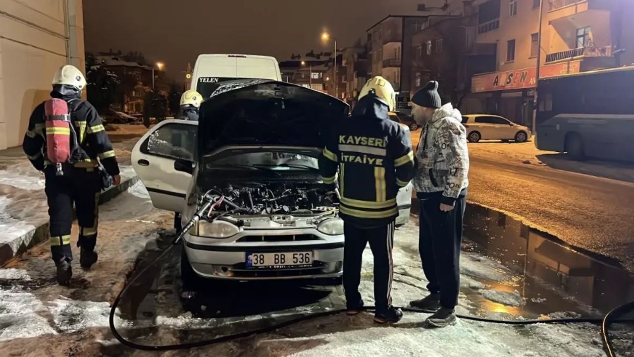 Bir süre aracın ısınmasını bekleyen sürücü, otomobilinin motor kısmından çıkan alevleri fark etti.