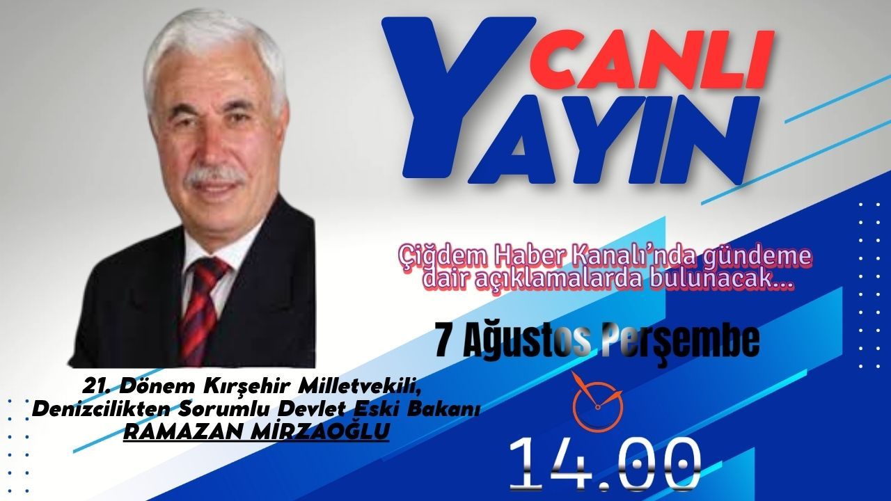 Kırşehir Çiğdem Haber, tecrübeli bir siyasetçiyi ağırlamaya hazırlanıyor. 21. Dönem Kırşehir Milletvekili ve Denizcilikten Sorumlu Eski Devlet Bakanı Ramazan Mirzaoğlu, 7 Ağustos Perşembe günü saat 14.00’te Kırşehir Çiğdem Haber’in canlı yayınında izleyicilerle buluşacak.
