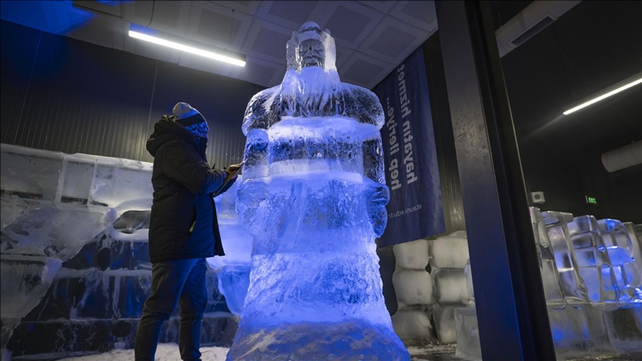 Erzurum'da Atatürk Üniversitesi öğrencileri, Ata Buz Müzesi'nde unutturmamak amacıyla buza işledikleri Türk mitolojisinde öne çıkan karakter ve malzemeleri sanatseverlere anlatıyor.
