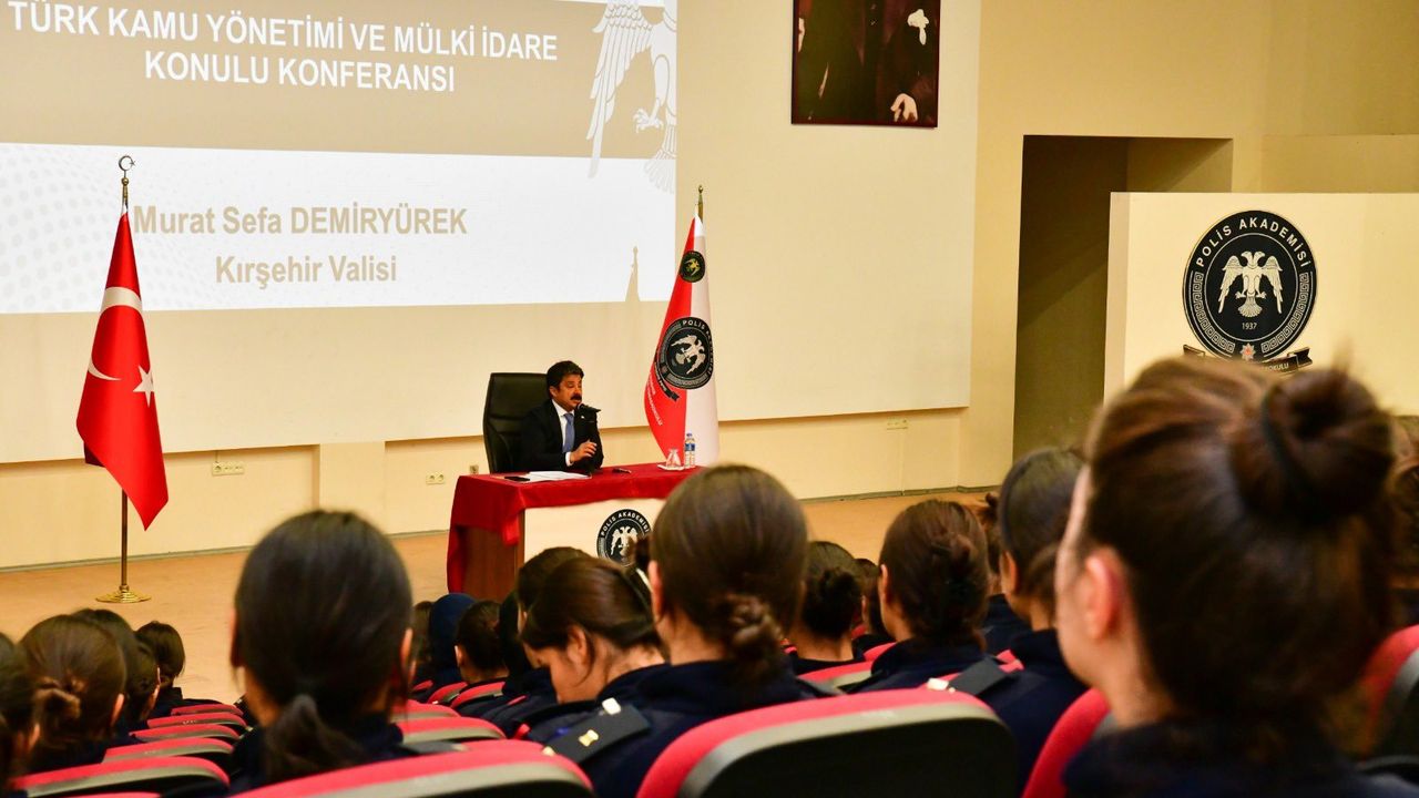 Kırşehir Valisi Murat Sefa Demiryürek ile Kırşehir Polis Meslek Yüksekokulu’nda söyleşi gerçekleştirildi. Kırşehir Polis Meslek Yüksekokulu düzenlenen program kapsamında Vali Demiryürek, öğrencilere Kamu Yönetimini anlattı. Vali Demiryürek, Kırşehir Polis Meslek Yüksekokulu öğrencilerine “Türk Kamu Yönetiminin Temel İlkeleri ve Mülki idare” konusunda bilgi verdi.